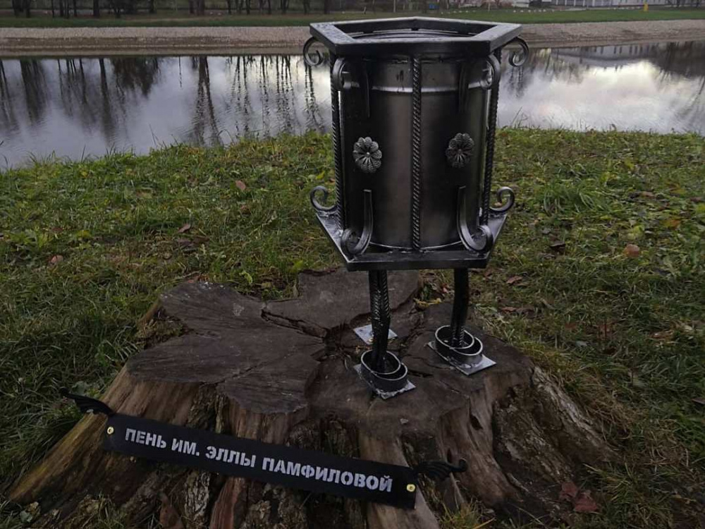 В Вологде на набережной у Соборной горки появился необычный арт-объект. Это старый пень, на котором установлена кованая урна с прорезью для голосования, а внизу прикреплена табличка «Пень имени Эллы Памфиловой».