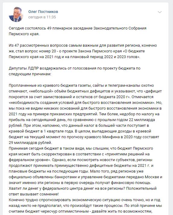 Руководитель партии ЛДПР в краевом ЗС Олег Постников на своих страницах в соцсетях указал причины, по которым однопартийцы сегодня воздержались от голосования по проекту бюджета.