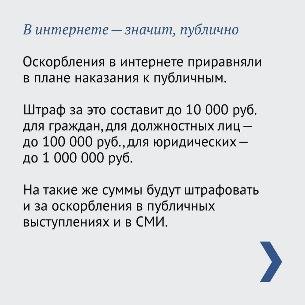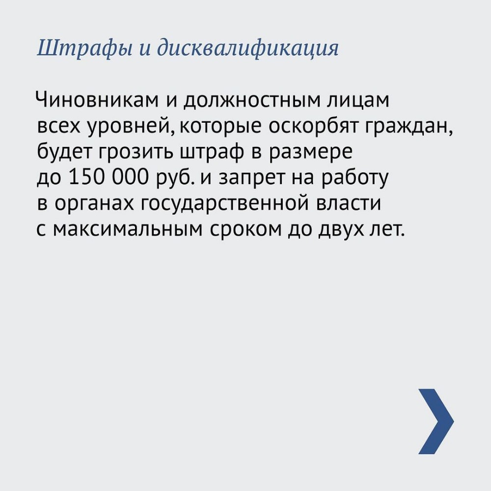 Госдума приняла закон о введении административных штрафов до 150 тысяч рублей для чиновников за оскорбление граждан. Документ также приравнивает оскорбления в интернете к публичным и предусматривает штраф до 3 млн рублей за клевету для юридических лиц.