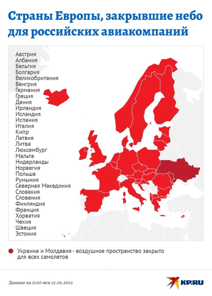Вчера, 27 февраля, глава Еврокомиссии Урсула фон дер Ляйен на пресс-конференции в Брюсселе заявила, что воздушное пространство стран входящих в ЕС будет закрыто для российских самолётов.
