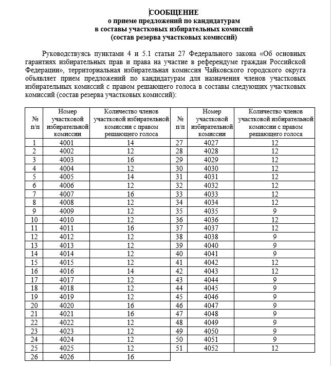 В Чайковском на ближайшие пять лет выберут новые составы участковых избирательных комиссий. Решение будет принято в период с 15 по 16 мая на заседании территориальной избирательной комиссии по вопросу формирования составов участковых избирательных комиссий.