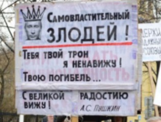 На плакате был изображён Владимир Путин, на голове которого корона. На плакате виднелась надпись: «Самовластительный злодей». После настоятельной просьбы представителей правоохранительных органов плакат был убран.