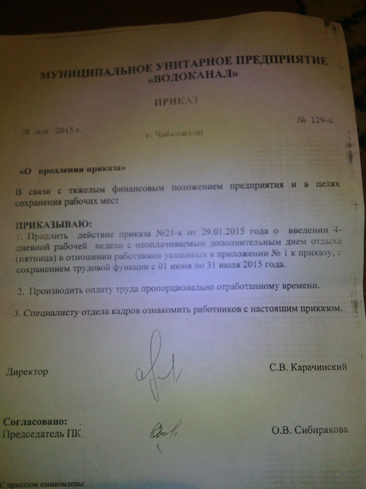Прилагаем фотографию письма к главе Чайковского муниципального района и приказа о переходе на 4-дневную рабочую неделю, присланные сотрудниками предприятия: