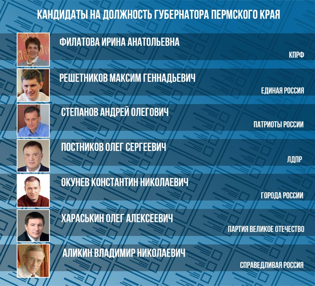 29 июня завершился период выдвижения кандидатов на выборы губернатора Пермского края. Всего документы на выдвижение представили семь кандидатов: Филатова Ирина Анатольевна (КПРФ), Решетников Максим Геннадьевич («Единая Россия»), Степанов Андрей Олегович («Патриоты России»), Постников Олег Сергеевич (ЛДПР), Окунев Константин Николаевич («Города России»), Хараськин Олег Алексеевич («Партия Великое Отечество»), Аликин Владимир Николаевич («Справедливая Россия»).