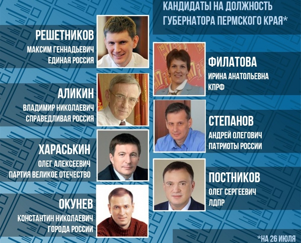 26 июля в Избирательной комиссии Пермского края завершился период приёма документов на регистрацию кандидатов на выборы губернатора Пермского края. Всего документы на регистрацию представили все семь заявившихся ранее кандидатов: Решетников Максим Геннадьевич («Единая Россия»), Филатова Ирина Анатольевна (КПРФ), Аликин Владимир Николаевич («Справедливая Россия»), Степанов Андрей Олегович («Патриоты Россия»), Хараськин Олег Алексеевич («Партия Великое Отечество»), Постников Олег Сергеевич (ЛДПР), Окунев Константин Николаевич («Города России»).