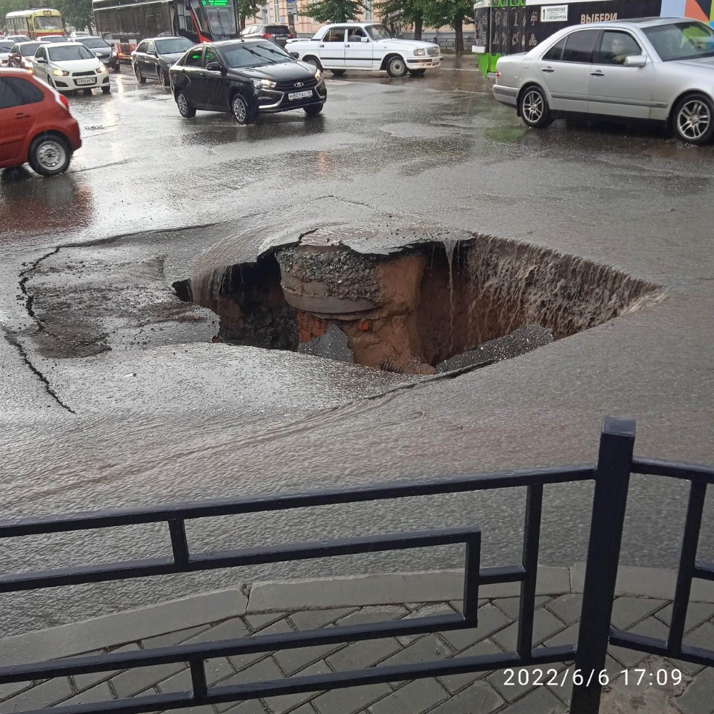 Провал произошёл на перекрёстке улицы Ленина и Коммунаров. В образовавшуюся яму провалился легковой автомобиль. Об этом сообщила редакция «Izhlife.ru». Вот как выглядит этот провал: