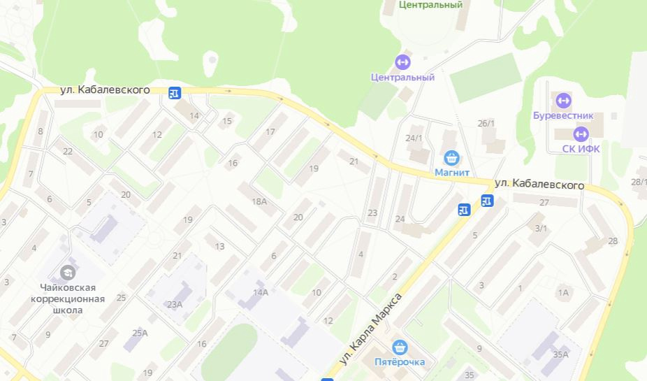 по улице Кабалевского (от главного входа в «Чайковский парк культуры и отдыха» до перекрестка ул. Кабалевского – ул. Ленина);