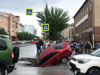 В Ижевске после ливня, который прошёл днём 6 июня, провалился кусок проезжей части.