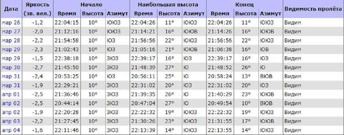 Чуть менее ярко международная космическая станция будет видна в небе 8, 9, 11, 12, 13 и 29 марта. Другие полёты МКС можно отследить при помощи таблицы. Пользоваться ей просто: чем ниже величина в графе «яркость», тем отчетливее будет видно станцию.