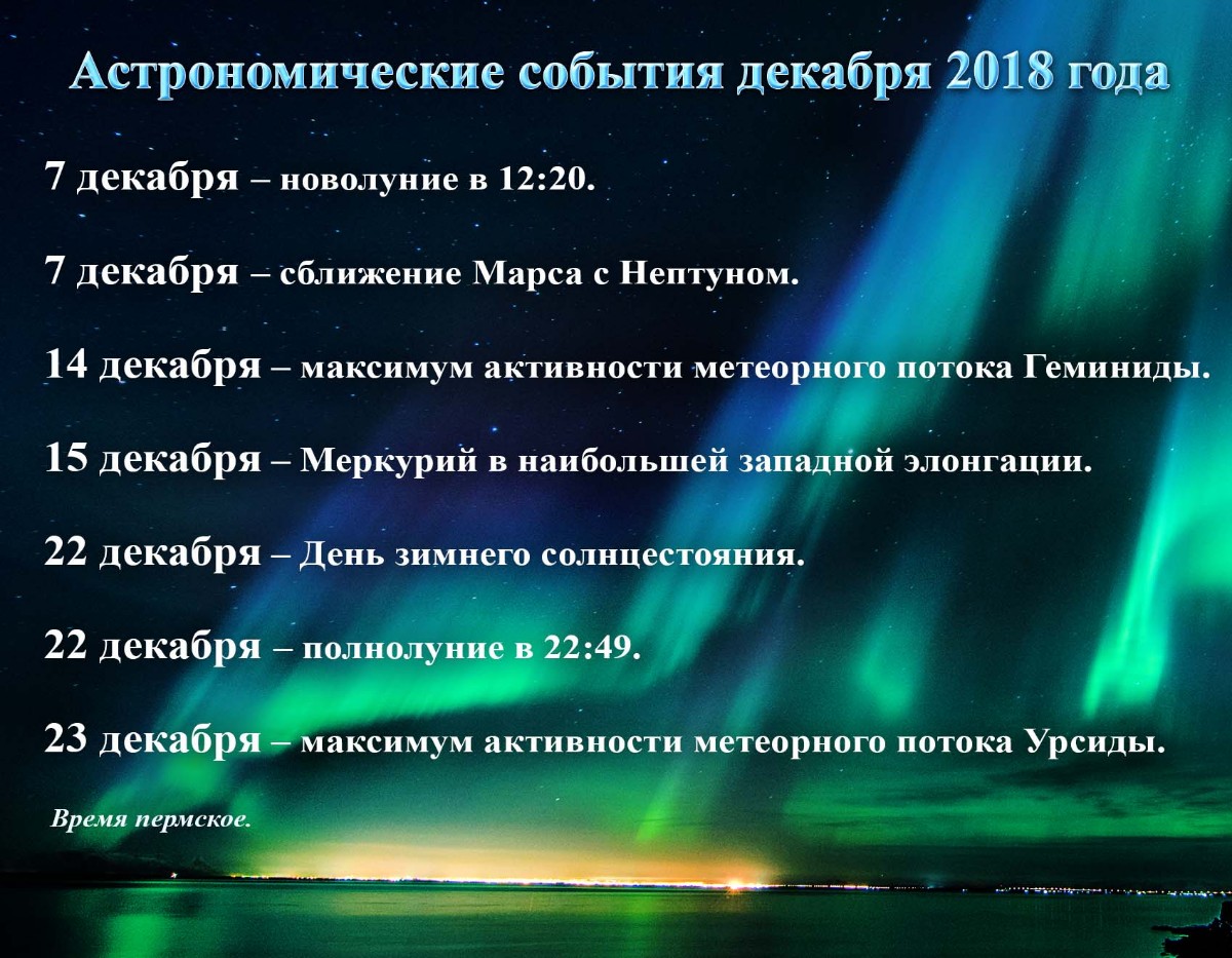 22 декабря будет днём зимнего солнцестояния — солнце окажется в наиболее низком положении над горизонтом. Этот световой день станет самым коротким за зиму, потом продолжительность светлого времени суток будет увеличиваться. В тот же день в 22:49 произойдёт полнолуние.