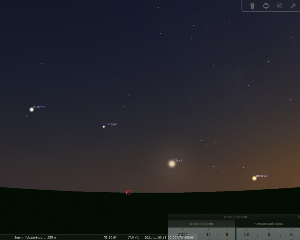 «В целом предстоящее событие можно назвать мини-парадом планет: у самого горизонта будет видна Венера, чуть восточнее можно увидеть Луну, затем Сатурн и Юпитер. К сожалению, для парада планет они не находятся в узком поле зрения: на него обычно требуется не более десяти градусов. А здесь их будет разделять почти 50 градусов, если считать от Юпитера до Венеры», — рассказал он.