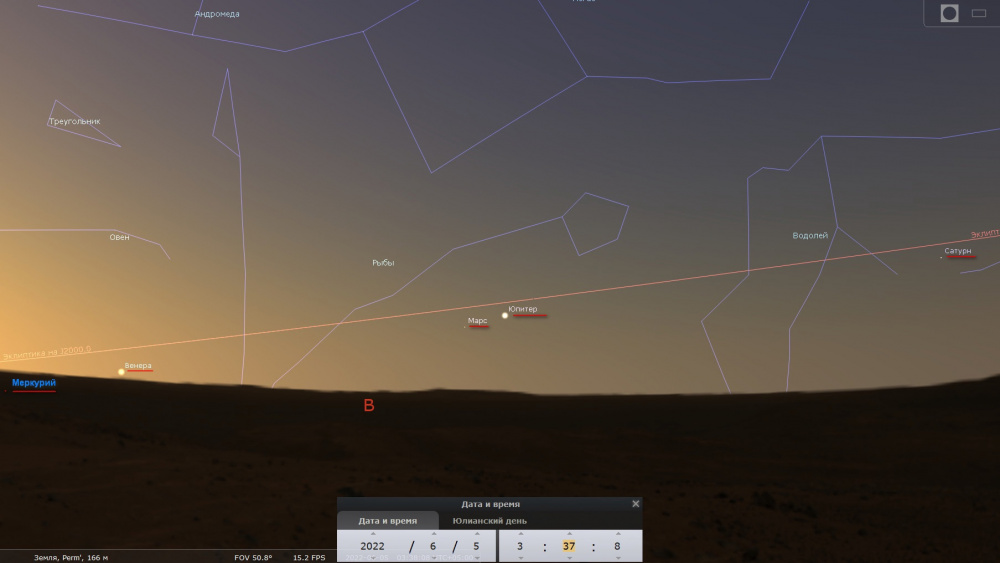 «Видимые парады с участием пяти ярких планет происходят не чаще, чем раз в 18-20 лет, и последний тесный парад из 5 планет в секторе 38 градусов состоялся в марте 2022 года, но условия видимости его были неблагоприятны для жителей России. Зато с 5 июня по 10 июля 2022 года нам повезёт и можно будет увидеть в 03:30 все пять планет одновременно, но уже в секторе 115 градусов», - сообщили специалисты планетария.