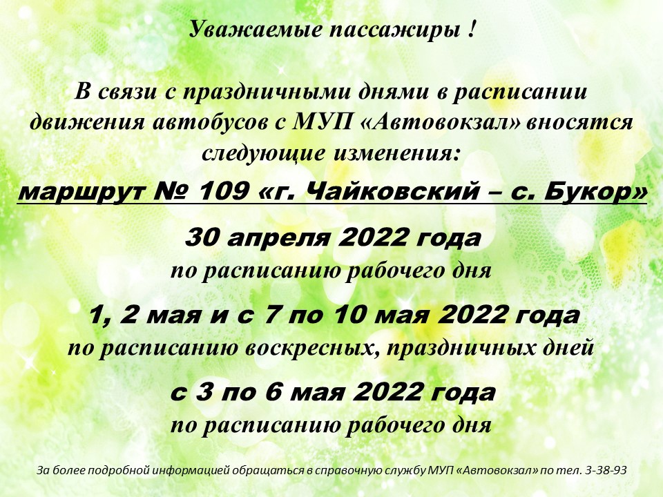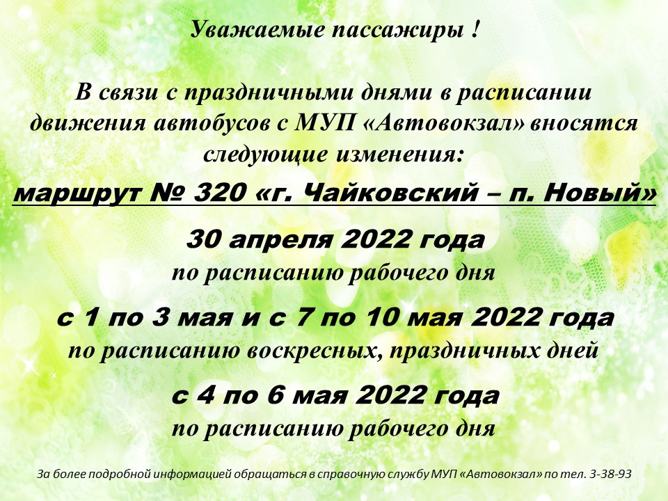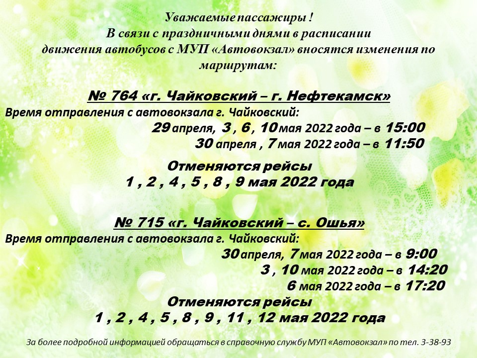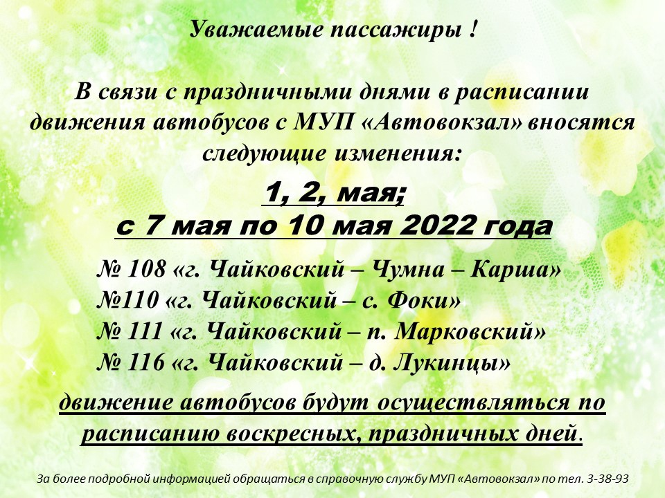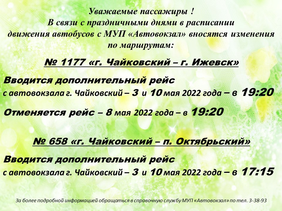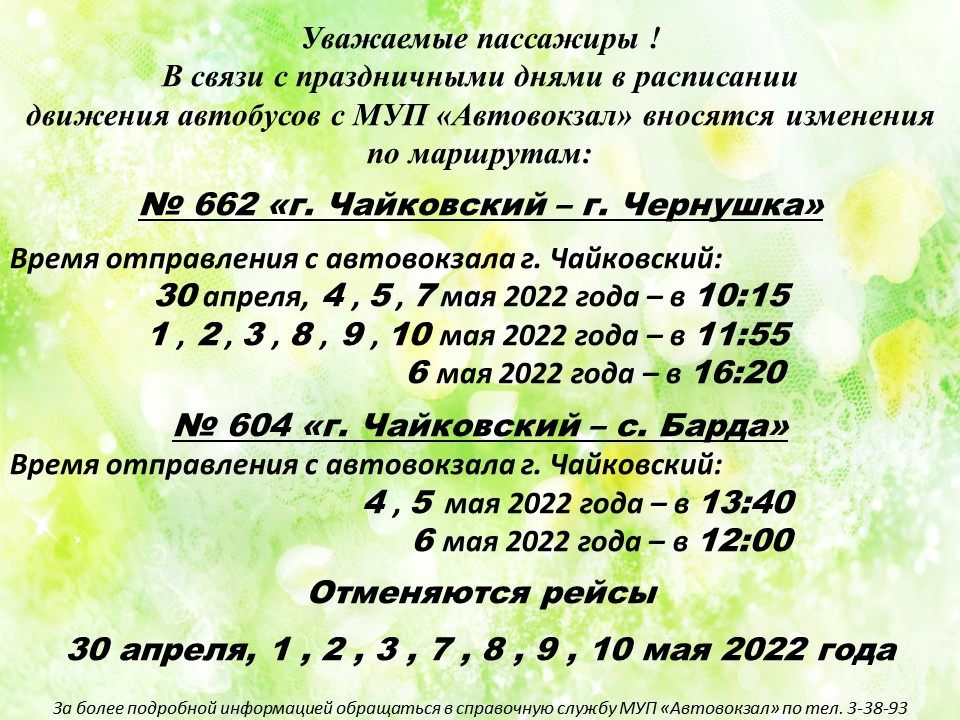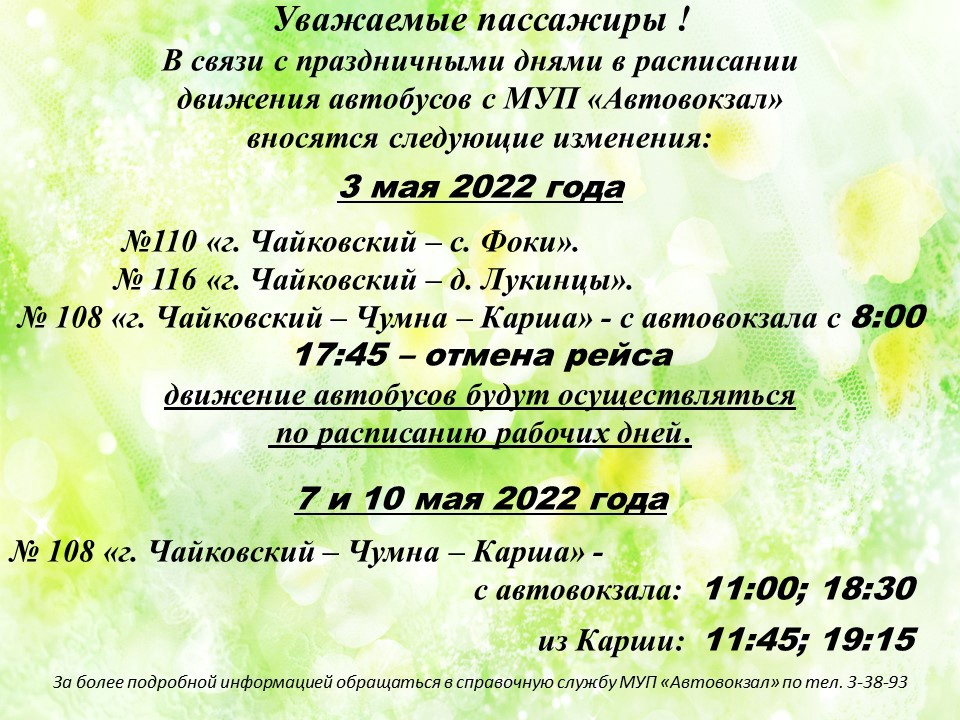 В связи с праздничными днями в расписании движения автобусов МУП «Автовокзал» также вносятся изменения по направлениям до Карши, Фоки, Марковский, Лукинцы, Нефтекамск, Ошья, Букор, Ижевск, Октябрьский, Чернушка, Барда, Новый.