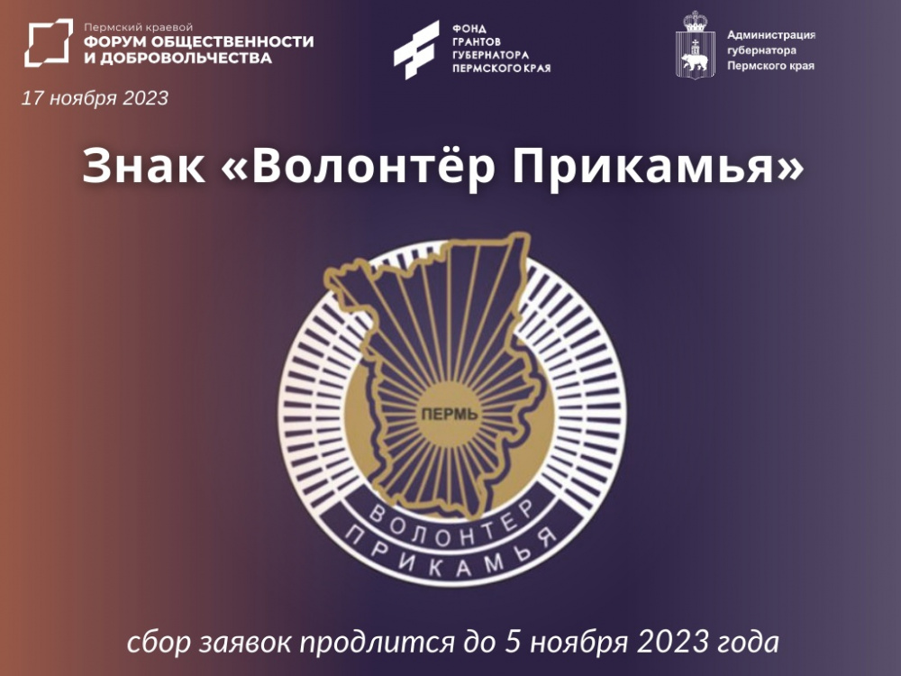 Отметим, в этом году вручение знака «Волонтёр Прикамья» состоится в рамках краевого форума общественности и добровольчества. Он состоится 17 ноября во Дворце Молодёжи г. Перми.