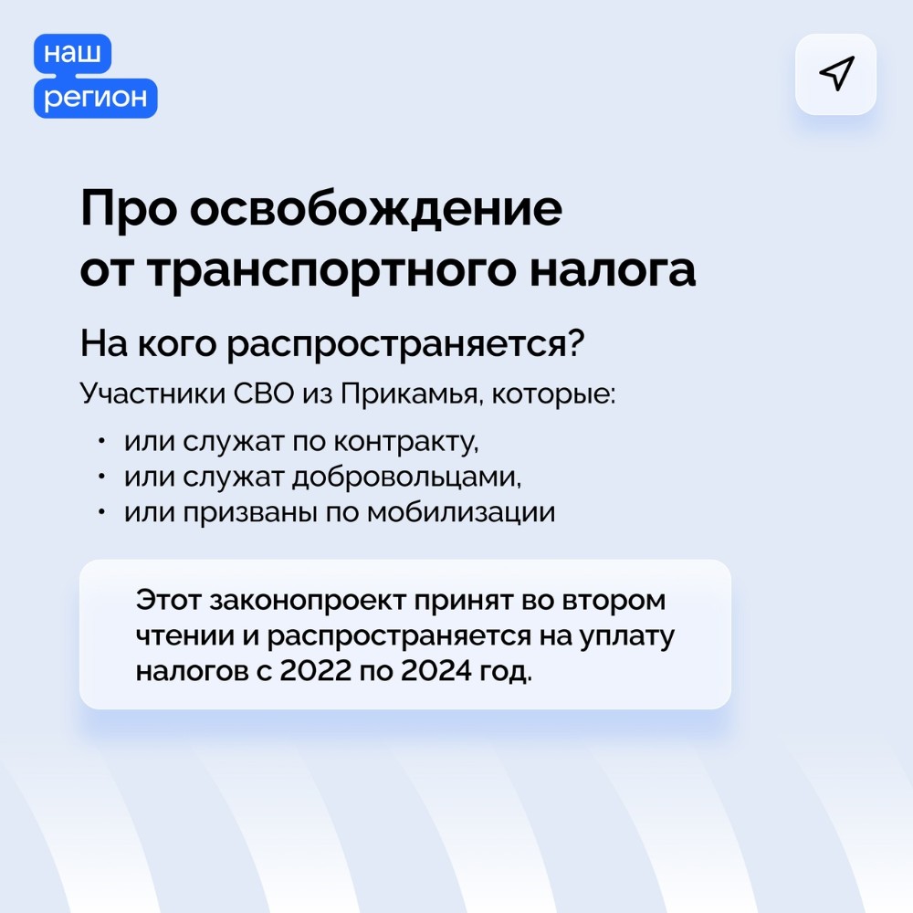 Проект закона об освобождении от уплаты транспортного налога принят в двух чтениях и уже реализуется. Им могут воспользоваться все участники СВО: контрактники, добровольцы, мобилизованные. Но есть примечание: льгота применима в отношении только одного транспортного средства.