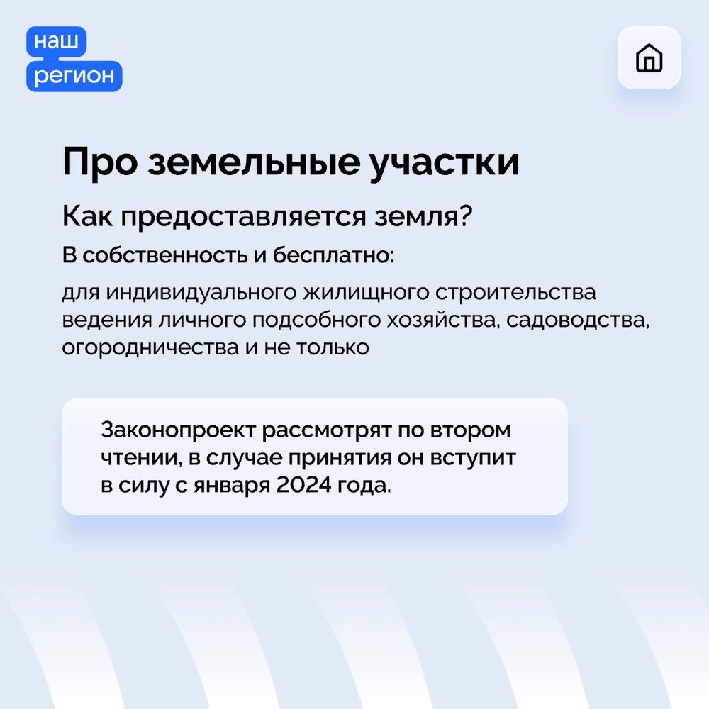 Проект закона о бесплатных земельных участках принят только в первом чтении. В случае принятия законопроекта во втором чтении (в ноябре), новая мера поддержки вступит в силу с января 2024 года.