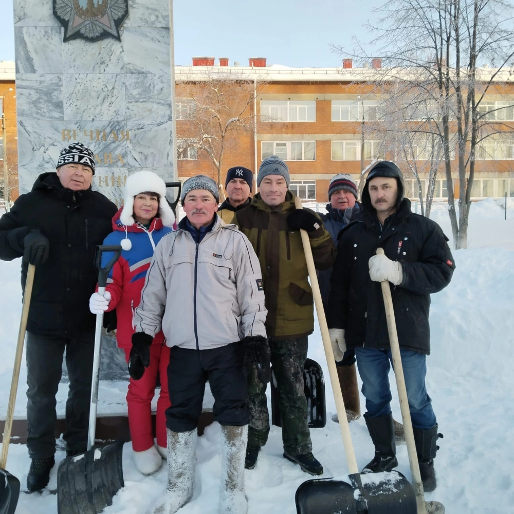 Волонтёры очистили от снега территорию около памятника воинам, погибшим во время Великой Отечественной Войны в школьном сквере, а также убрали снег вокруг стеллы пограничникам, участникам военных действий и погибшим в локальных военных конфликтах.