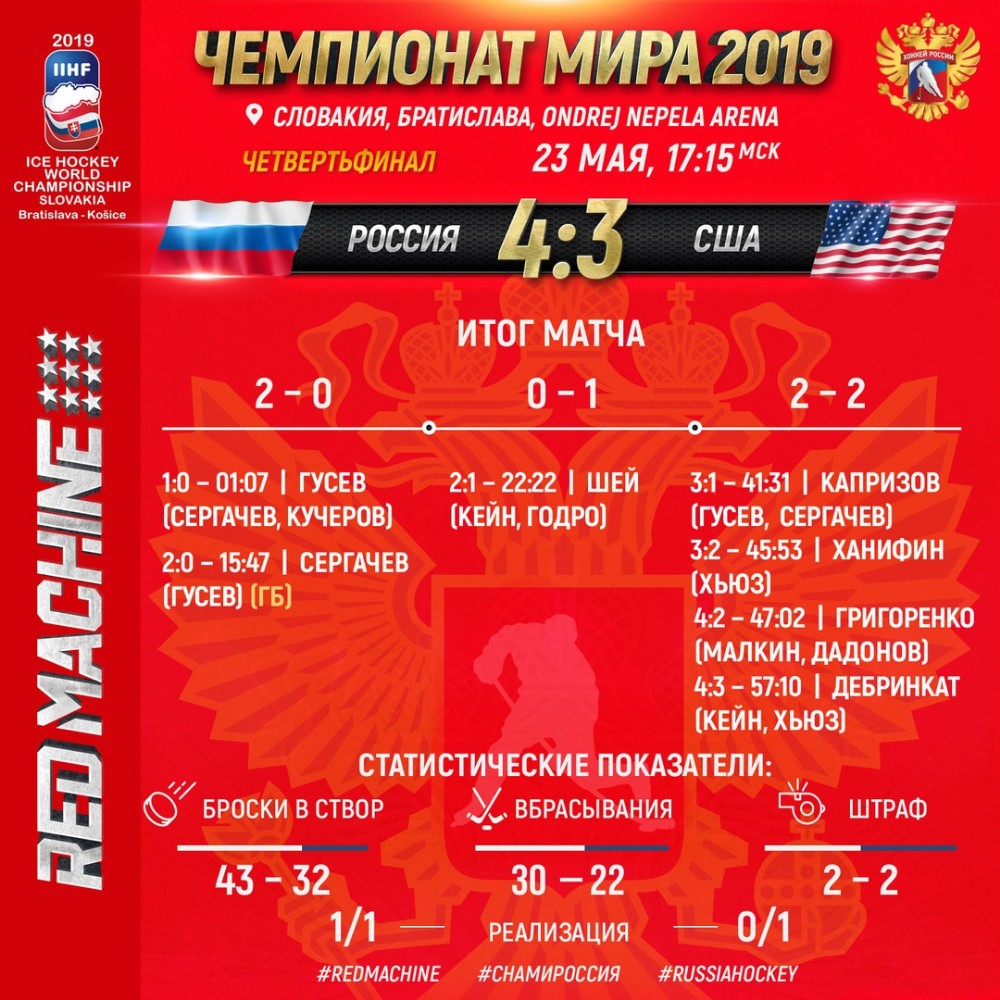 Отметим, Россия стала единственной командой на чемпионате мира, выигравшей все матчи группового этапа. Хоккеисты российской сборной выиграли восьмой матч из восьми на турнире, заняв первое место в турнирной таблице группы B. Американцы стали четвёртыми в группе А, в их активе было пять побед при двух поражениях.
