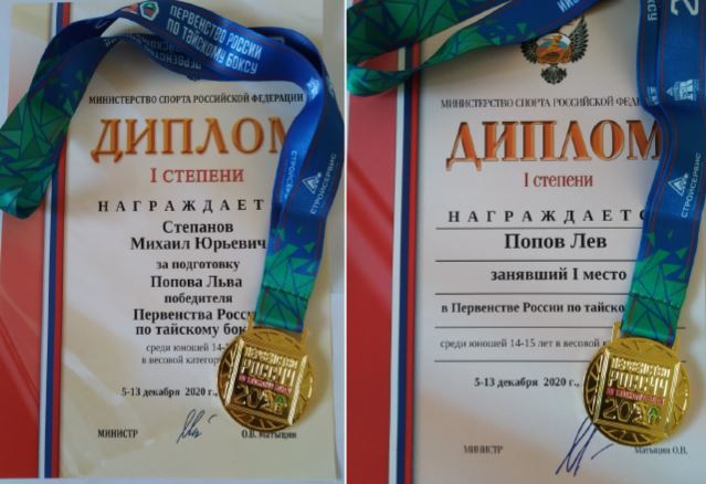 По результатам соревнований Лев будет представлять нашу страну на международных соревнованиях. Стоит также отметить, что в 14 лет он выполнил норматив Кандидата в мастера спорта. Его тренер Степанов Михаил Юрьевич награждён дипломом 1 степени Министра спорта РФ за подготовку победителя Первенства России по тайскому боксу.