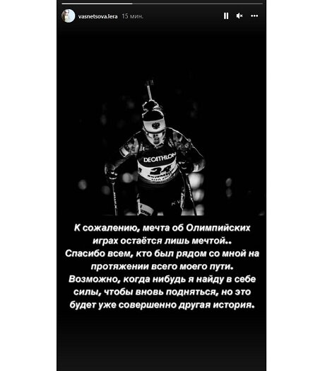 «К сожалению, мечта об Олимпийских играх остаётся лишь мечтой. Спасибо всем, кто был рядом со мной на протяжении всего моего пути. Возможно, когда-нибудь я найду в себе силы, чтобы вновь подняться, но это будет уже совершенно другая история», — написала Васнецова в Instagram.