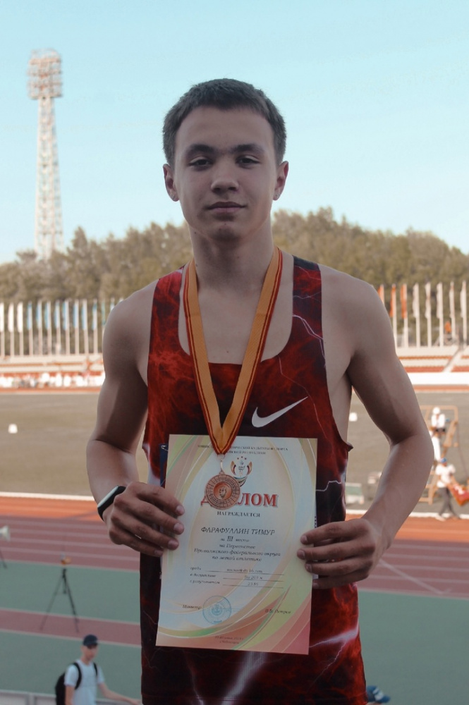 Тимур Фарафуллин воспитанник стадиона "Центральный", тренируется у Пинкус Антона Евгеньевич. Ранее, в феврале 2022 года, на всероссийских соревнованиях по лёгкой атлетике среди юношей до 14 лет наш спортсмен установил два всероссийских рекорда, завоевав золотую медаль.