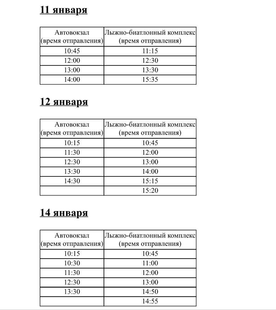 Автобусы будут курсировать от автовокзала до лыжно-биатлонного комплекса ФЦП «Снежинка» и в обратном направлении 11, 12 и 14 января.