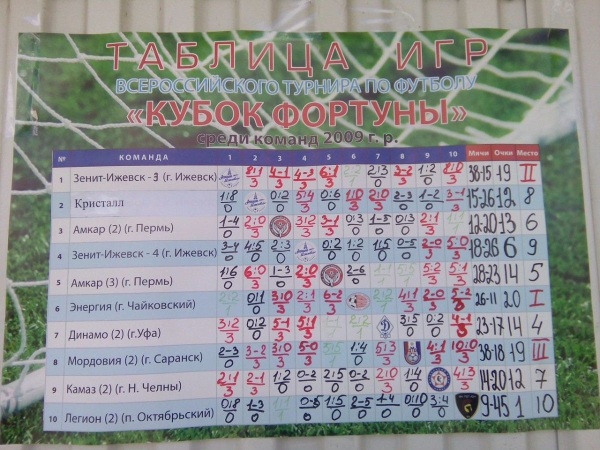 Всероссийский турнир по футболу «Кубок Фортуны» проходил с 5 по 7 мая в Ижевске. В соревнованиях принимали участие мальчики 2009 г.р. Всего за главный приз боролись десять команд. Среди претендентов на призовые места были команды «Мордовия» из Саранска, «Динамо» из Уфы, «Легион» из г.Октябрьский (Башкортостан), «Камаз» из Набережных Челнов, ижевские команды «Зенит» и «Кристалл». В упорной борьбе ребята из чайковского клуба «Энергия» оказались сильнее конкурентов и завоевали главный приз турнира - Кубок.