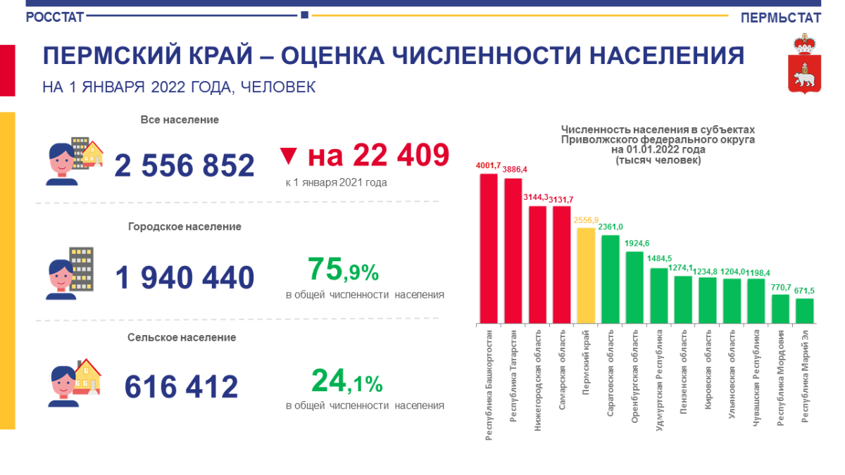 В связи с этими данными, Пермский край находится на пятом месте по численности населения в Приволжском ФО.