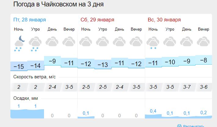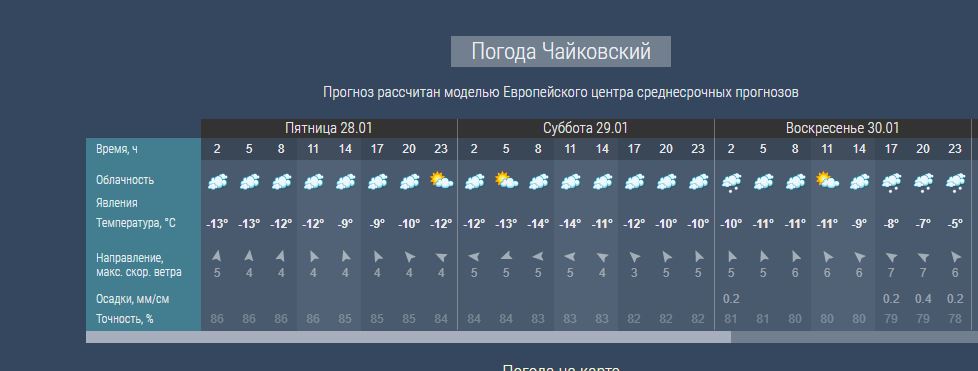 — Ожидается облачная с прояснениями погода, в отдельных районах пройдёт небольшой снег. Минимальная температура в большинстве районов составит -14… -19°С, днём воздух прогреется до -8… -13°С, — рассказали специалисты. — К воскресенью регион попадёт на периферию обширного циклона с центром над Балтикой. В его системе на Пермский край начнёт поступать более тёплый воздух, поэтому к вечеру в южных и центральных районах температура воздуха повысится до -4… -9°С. На севере и востоке максимум температуры ожидается на несколько градусов ниже. В течение суток будет преобладать облачная погода с небольшим снегом.