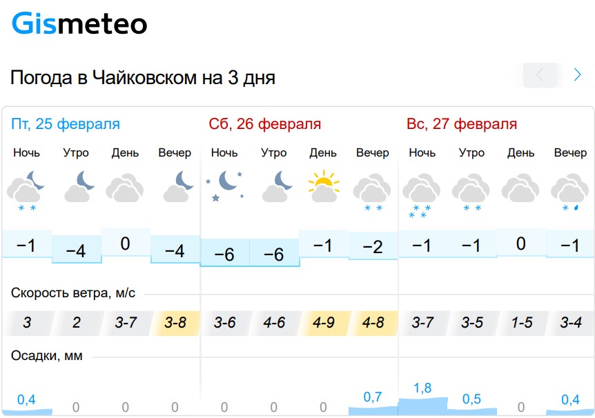 В Чайковском осадки стоит ждать под вечер субботы и в воскресение. Средняя температура воздуха в выходные -3…-1°. Скорость ветра к вечеру субботы может достигнуть 9 м/с, но к воскресенью спадёт до средней отметки - 3-4 м/с.