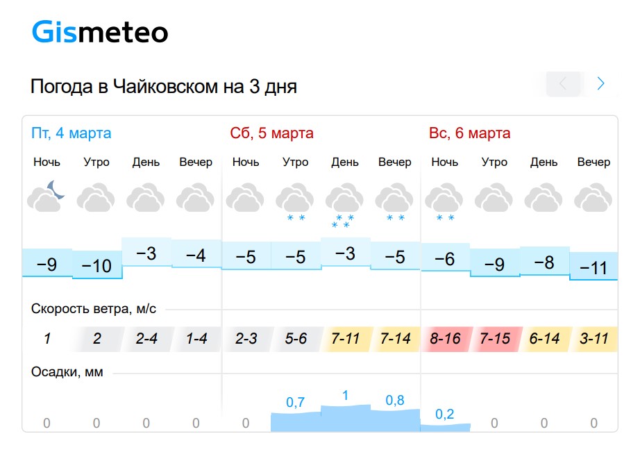 В субботу, 5 марта, в Чайковском ожидается снегопад, во второй половине дня – усиление ветра до 14 м/с. Средняя температура -5°. Воскресенье, 6 марта, пройдёт без осадков, но с сильным ветром. В первую половину дня он может подняться до 16 м/с. Кроме того - значительно похолодает, до -11°.