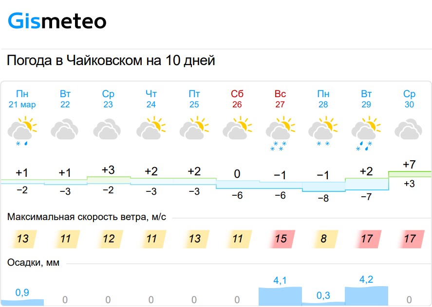 В Чайковском, не смотря на прогнозируемое повышение осадков в крае, осадков практически не ожидается - они возможны лишь в понедельник, 21 марта. Разброс дневных температур на всю неделю – от -3° до +3°C. Скорость ветра будет держаться на уровне 11 – 13 м/с.