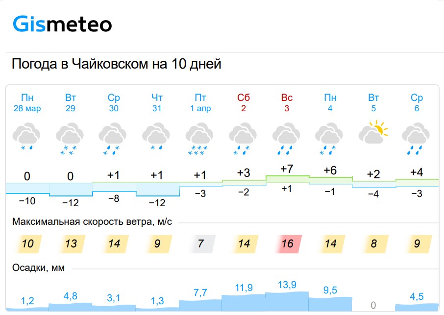 В Чайковском, как и во всём крае, ожидаются постоянные осадки, небо будет затянуто тучами. Температура воздуха практически не будет подниматься выше нуля. Кроме того, скорость ветра к середине рабочей недели может достигнуть 14 м/с.