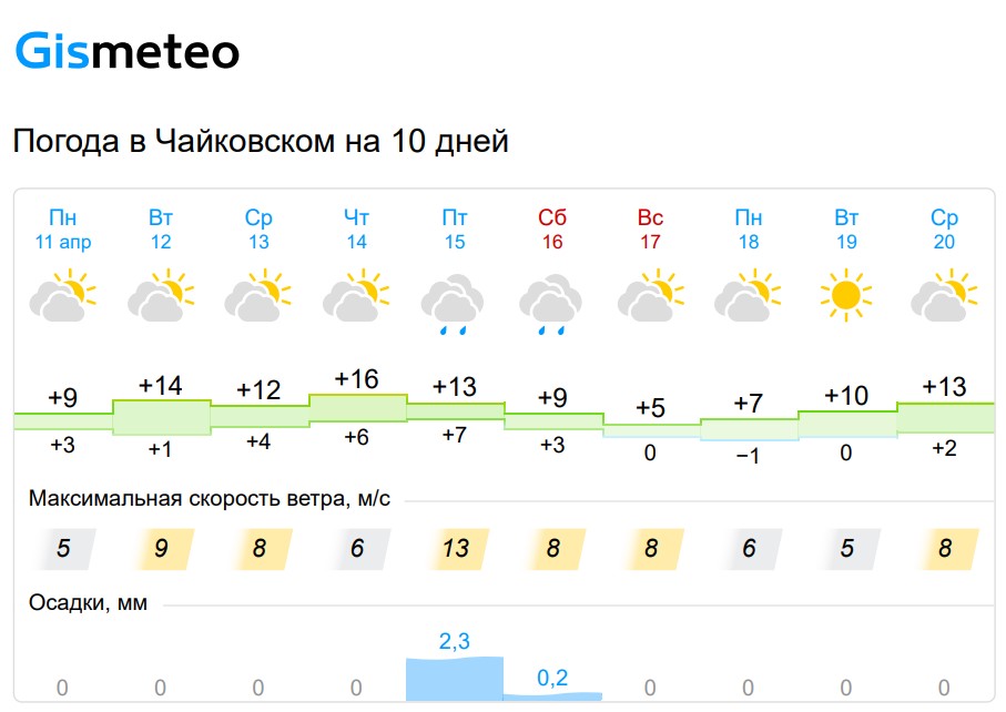 В Чайковском погода также будет тёплой, температура воздуха к четвергу может подняться до 16°C. Небольшие осадки возможны только в пятницу, 15 апреля. В остальные дни прогнозируется лишь переменная облачность, без осадков. Ветер, в большинстве своём, восточный, а его скорость будет в пределах нормы.