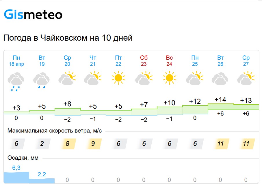 В Чайковском температура на неделе не поднимется выше 8°C. Существенные осадки прогнозируются в понедельник, небольшие – во вторник, зато в остальные дни обещают быть солнечными и без осадков. Скорость ветра в пределах нормы.