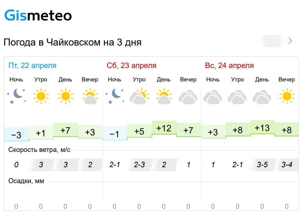 В Чайковском погода ожидается не столь солнечная, как в прогнозе на весь регион. Переменная облачность будет утром и днём субботы, а полностью солнце выглянет только под вечер воскресенья. Несмотря на это, температура воздуха днём будет +12…+13°. Осадков, как и сильного ветра, также совсем не ожидается.
