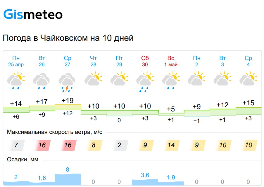 В Чайковском первая половина недели, вплоть до среды, отмечается увеличением температуры и количества осадков. В среду ожидаются дожди и грозы, а также сильный ветер, до 16 м/с. Начиная с четверга, придёт похолодание, которое продержится до конца недели.
