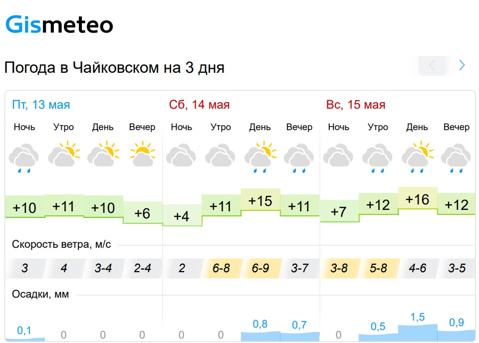 Согласно информации сайта метеорологов Gismeteo.ru, выходные 14 и 15 мая в Чайковском будут пасмурными, вторая половина дня субботы будет сопровождаться небольшим дождём, а в воскресенье осадков стоит ждать с самого утра.