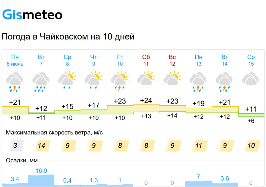 Согласно информации сайта метеорологов Gismeteo.ru, рабочая неделя в Чайковском будет пасмурной и дождливой. Ко вторнику может похолодать – температура опустится до +11…+12°, однако пойдёт на повышение к концу недели, достигнув в пятницу отметки в +23°.