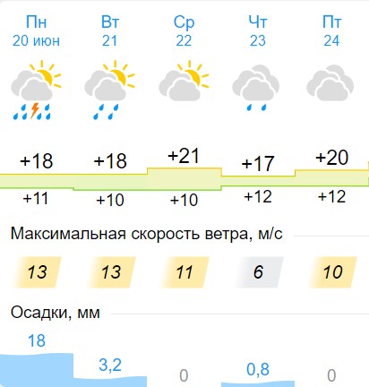Согласно информации проекта «Метеоролог и Я», в начале недели погоду в регионе сформирует углубляющийся северо-западный циклон, который принесёт с собой умеренные и сильные дожди и порывы ветра до 15 м/с.