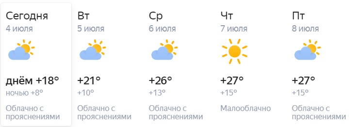 Согласно информации проекта «Метеоролог и Я», начиная с 6 июля, в регион начнёт поступать очень тёплый воздух с западных районов Европейской территории России. Впервые с начала летнего сезона температура воздуха превысит отметку +30°C, однако начало недели будет прохладным.