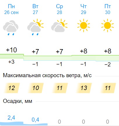 Всю рабочую неделю в Чайковском температура воздуха будет держаться ниже 10°, а в ночные и утренние часы столбик термометра и вовсе опустится ниже 0°. В целом на неделе ожидается достаточно ясная погода, однако в понедельник и вторник возможны небольшие осадки.