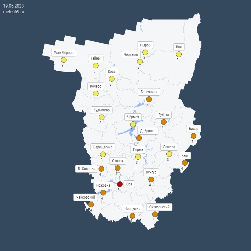 В пятницу, 19 мая, Оса первая и пока единственная в этом году перешла на 5 класс (чрезвычайный) пожарной опасности. Ещё на 12 станциях отмечается 4 класс (высокий) пожарной опасности, в том числе и в Чайковском округе.