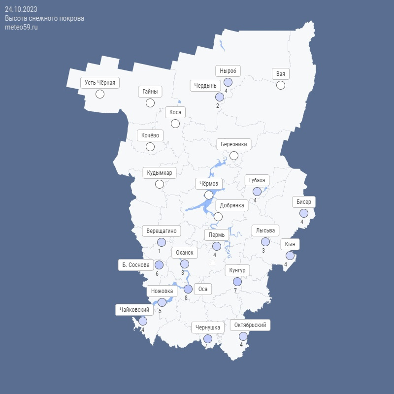По данным специалистов портала «Метеоролог и я», снежный покров наблюдается на всей территории Пермского края. Но максимальная его толщина отмечается по югу Прикамья. В некоторых районах высота достигла 7 см и более. В Чайковском по данным синоптиков выпало 4 см осадков.