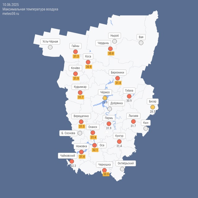 Что касается города Чайковского, то согласно данным, которые были зафиксированы на местной метеостанции, воздух вчера прогрелся до +32.3°С. Предыдущий рекорд температуры +30.4°С был установлен в 1998 году.