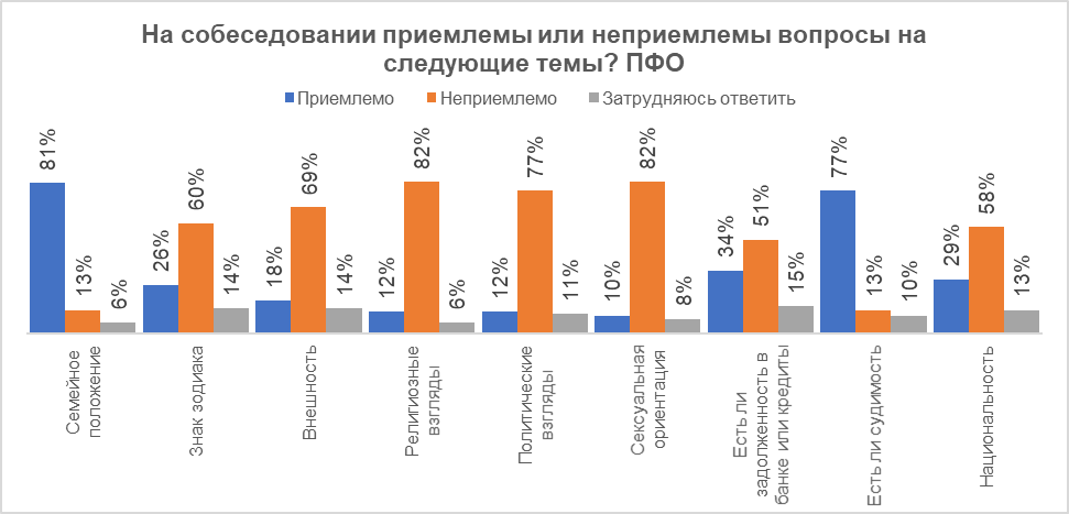Также в ходе опроса респонденты указали, какие вопросы, по их мнению, приемлемы на собеседовании, а каких стоит избегать работодателям. Так, интерес к семейному положению со стороны компании у 81% вызывает понимание, не приемлемыми такие вопросы считают только 13% опрошенных. А вот вопросы о внешности, знаке зодиака, религиозных взглядах, а также политических убеждениях и сексуальной ориентации вызывают наибольший негатив и непонимание со стороны соискателей.